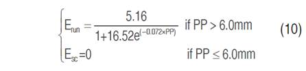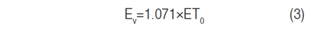 The potential evapotranspiration (ETp) of the crop is mandatory to calculate ET0, which was estimated by Equation 3 and 4 (Ramírez et al., 2010), where EV=evaporation (mm), PP=precipitation (mm) and Kc=crop coefficient. As this Kc has not been measured for Colombia, therefore, the value reported by (Ramírez et al., 2010) were used in this case, given the planting density and age of the plants.