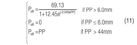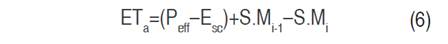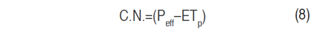 The actual crop evapotranspiration (ETa) was estimated using the water balance model of Thornthwaite-Mather and modified by Jaramillo (2006) (Equation 4). This equation was applied in conjunction with the expressions of Equation 6 to Equation 11, where Peff=effective precipitation (mm), Erun=runoff (mm), θv.cc=volumetric soil moisture at field capacity or water retained at -33 kPa (%), θv.pmp=volumetric soil moisture at the permanent wilting point or water retained at 1.500 kPa (%), C.W.=water storage capacity, RDe=effective root depth, S.M=stored moisture, and C.N.=cumulative negative function. Under the condition that when the water retained in the soil in the effective range of the roots equals the retention capacity, the crop transpires at maximum capacity (ETa=ETp), and the above equations, which are given in terms of effective precipitation (Peff), correspond to the condition of open crop exposure. This condition was assumed because it is the most unfavorable scenario concerning crop evapotranspiration (compared to a shaded condition). The details of the expressions described above can be found in Jaramillo (2006); Ramírez et al. (2010).