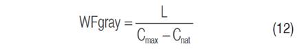 For the calculation of the gray water footprint (WFgray) in m3 ha-1, the amount of applied fertilizer or load (L) (in kg ha-1 of nitrogen) is divided into the difference between the maximum allowable concentration and the natural concentration (Cnat of N, kg m-3) according to the following expression: