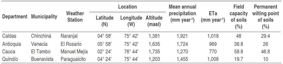 Table 1: Basic information related to the departments, meteorological stations used in the calculations of coffee cultivation and their environmental conditions.