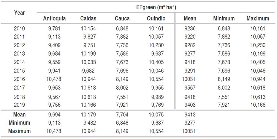 According to the results shown in Table 4, the WFgreen of the coffee crop for the sites and the study period varied between 6,254 m3 t-1 (in Antioquia - 2019) and 11,978 m3 t-1 (in Quindío - 2012). The department with the lowest mean water footprint was Cauca, with 8,168 m3 t-1, and the department with the highest mean WFgreen was Quindío, with 9,304 m3 t-1. There is a marked correlation between WFgreen and actual evapotranspiration, considering that the places with the lowest and highest green water footprint are also those with the lowest and highest average evapotranspiration for the study period (Table 4). Cauca showed the lowest values of evapotranspiration (Table 2) but also observed the lowest annual values of WFgreen, while Quindío showed the highest values for these two variables during the study period and departments.