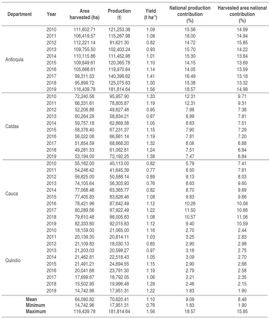 The minimum coffee productivity reported for the study period was 0.76 t ha-1 in the department of Cauca in 2013. The maximum was 1.56 t ha-1 in the department of Antioquia in 2019, while the total average productivity was 1.10 t ha-1.