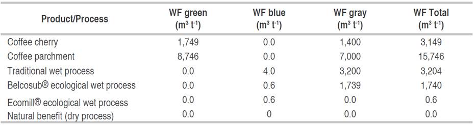 The conventional coffee mill has a WFblue of 4 m3 t-1, a WFgray of 3,200 m3 t-1, and does not have WFgreen because generally the mill does not incorporate atmospheric water in the process or is insignificant. The ecological Belcosub® coffee mill has a WFblue of 0.60 m3 t-1 and a WFgray 1,739 m3 t-1, while the ecological mill Ecomill® has a WFblue of 0.55 m3 t-1 and does not have WFgray because it has no discharges (few leachates are generally used as fertilizer for cultivation). The natural benefit of coffee is a totally dry process, it does not use water to transport and wash the coffee and it does not generate spillage; therefore, it does not have a water footprint, however, it is no longer a widely used practice.