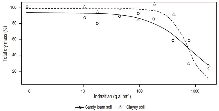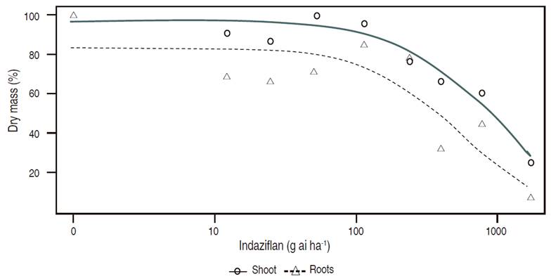 A reduction in dry root mass was observed in the sandy loam soil with lower doses of indaziflam (95.15±89.59 g ai ha-1), when compared to the shoot in this same soil (162.61±112, 12 g ai ha-1). In clay soil, the doses of indaziflam required for a 10% reduction in root dry matter were 306.93±97.72 g ai ha-1. The reduction in biomass and morphology of the root system by indaziflam has also been observed in other studies (Jones et al., 2013; Brabham et al., 2014; Jones et al., 2015; Schneider et al., 2015).