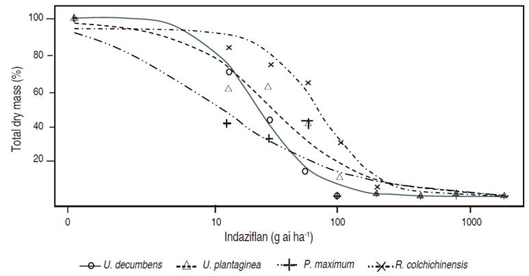 Y=Total dry mass; α=maximum value; x=indaziflam dose in g ai ha-1; b= resulting dose at 10, 50 and 90% reduction in total dry mass (ED10, ED50 e ED90); c=curve slope.