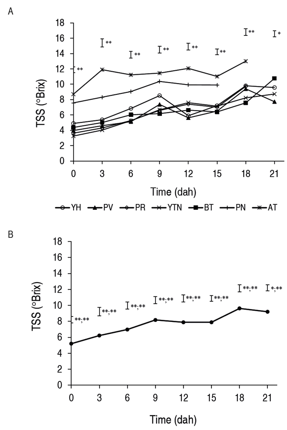 Figure 1: TSS A. in the different arracacha cultivars. B. average. YH: yema de huevo. PR: palirrusia. BT: blanca de tarro. AT: amarilla de tarro. PV: paliverde. YTN: yucatana. Vertical bars indicate the standard error (n=28). * and ** indicate significant effect according to the Tukey test for P≤0.05 and P≤0.01, respectively, between treatments before the semicolon and between times after the semicolon.