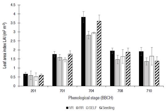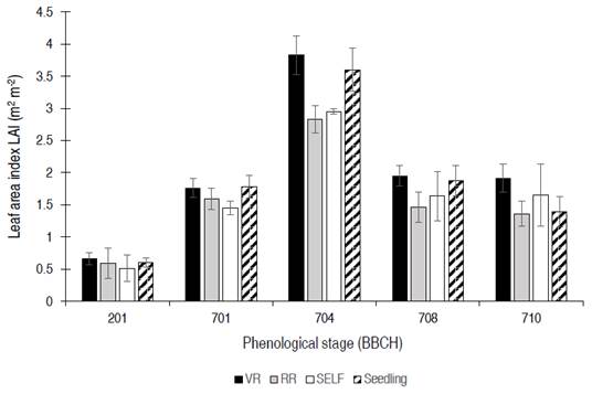 Figure 3: Leaf area index (LAI) among the different scion×rootstock combinations: vigor rootstock (VR), resistance rootstock (RR). Self-grafting (SELF) and plants no grafted (Seedlings), in different tomato phenological states (701, 704, 708, 710 and 712) according to the BBCH scale. Data are means±s.d. (n=4) and denote significant differences among combinations within each phenological stage, according to Honestly Significant Difference - HSD test (P <0.05).