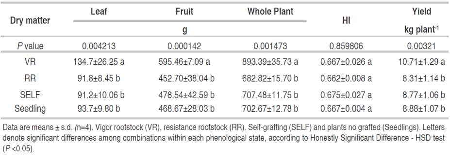Dry matter: the scion×rootstock combination that generated the greatest accumulation of dry biomass in leaves, fruits, and the whole tomato plant was the VR, differing significantly from the other combinations. VR accumulated 44% more leaf biomass and 28% more dry biomass in the entire plant, which can be related positively to the highest LAI reached at 704 phenological stage by RV (Figure 3, Table 2). However, although authors such as Nilsen et al. (2014) affirmed that the callus formed by the scion×rootstock union can reduce not only the flow of water to the shoots but also the leaf area and limits the transport of photoassimilates to the roots; this results in a slower growth of grafted plants than the non-grafted ones. In this study, the results did not show a negative effect leaf development by the scion×rootstock combinations evaluated (Figure 3, Table 2), the use of a rootstock with vigor characteristics (VR) represented a significant gain in the total dry matter of leaves and fruits in relation to the plants grafted in resistant rootstock (RR), self-grafted (SELF) and plants from seed (Figure 3); similar to that exposed by Calatayud et al. (2013) who indicate that leaf weight and leaf area are directly correlated, the higher the weight, the greater the leaf area.
