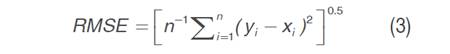 Due to E disadvantage, some measures based on the sum of squares were developed (Yang et al., 2014). The root mean square error (RMSE) (Equation 3) has the same unit of deviation y-x, and it is frequently used in both model calibration and validation process (Hoogenboom et al., 2019; Hunt and Parsons, 2011)
