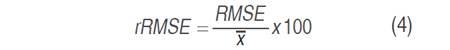 The relative root mean square error (rRMSE) (Equation 4) is a relative measure used for comparisons of different variables or models. indicating whether the magnitude of the root-mean-square error (RMSE) is low, medium, or high (Priesack et al., 2006).