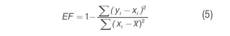Nash-Sutcliffe modeling efficiency coefficient (EF) (Equation 5) (Nash and Sutcliffe, 1970). This index is a dimensionless measure (-∞ to 1.0). A perfect fit between simulations and observations produces an EF-1.0.