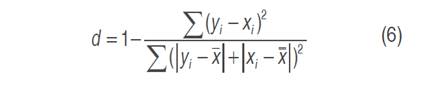 Another index that is commonly used in crop model evaluation is the index of agreement (d) (Equation 6) a dimensionless measure (0 to 1.0) proposed by Willmott (1982). This index has been recommended by researchers in modeling to carry out comparisons between simulated values and measured data (Krause et al., 2005; Moriasi et al., 2007).