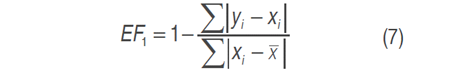 To overcome the difficulty of the statistics based on the sum of squares that are inflated by the squaring deviation term, statistics based on the sum of absolute values were proposed (Krause et al., 2005; Willmott et al., 2012). The modified efficiency coefficient (EF 1) (Equation 7) replaces the sum of squares term with the sum of absolute values of y-x . EF 1 is less sensitive to outliers, and it takes also values between -∞ and 1.0 (Legates and McCabe Jr, 1999).