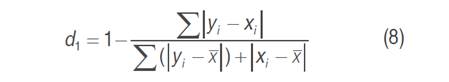 Willmott et al. (1985) proposed the modified index of agreement (d 1) (Equation. 8), to avoid the critical effect of outliers in the sum of squares used on d. The author remarks that d 1 yields 1.0 more slowly than d. d and d 1 show relative high values even if a substantial deviation is evident, and to overcome this issue, Willmott et al. (2012) proposed a refined index of agreement (d 1') (Equation 9), which is ranged -1.0 to 1.0. When , d1'=0.5, the sum of the magnitude of the errors is half of the sum of the perfect-simulated-deviation and observed-deviation magnitude.