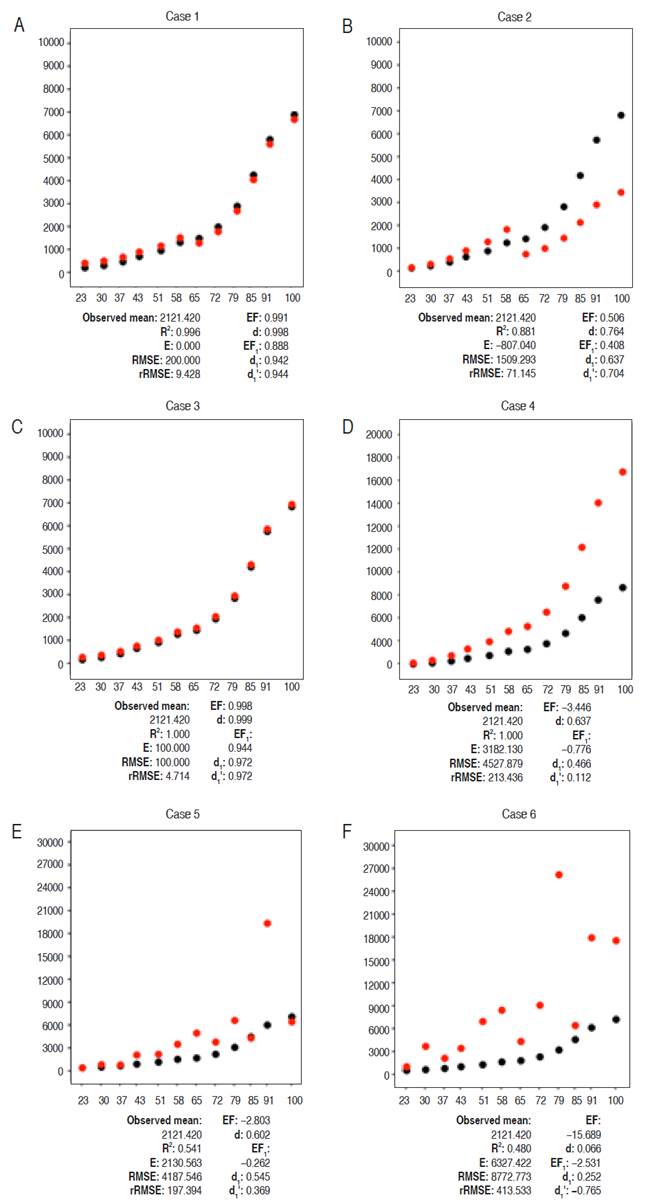 The indices are expected to inform the researcher of the accuracy of any model in simulating the observations. The statistical indices are expected to allow decisions to be made regarding the acceptance or rejection of the models. In this study, with the modifications applied to generate the six cases, the statistical indices must accept cases 1 and 3 and reject the other cases without ambiguity.