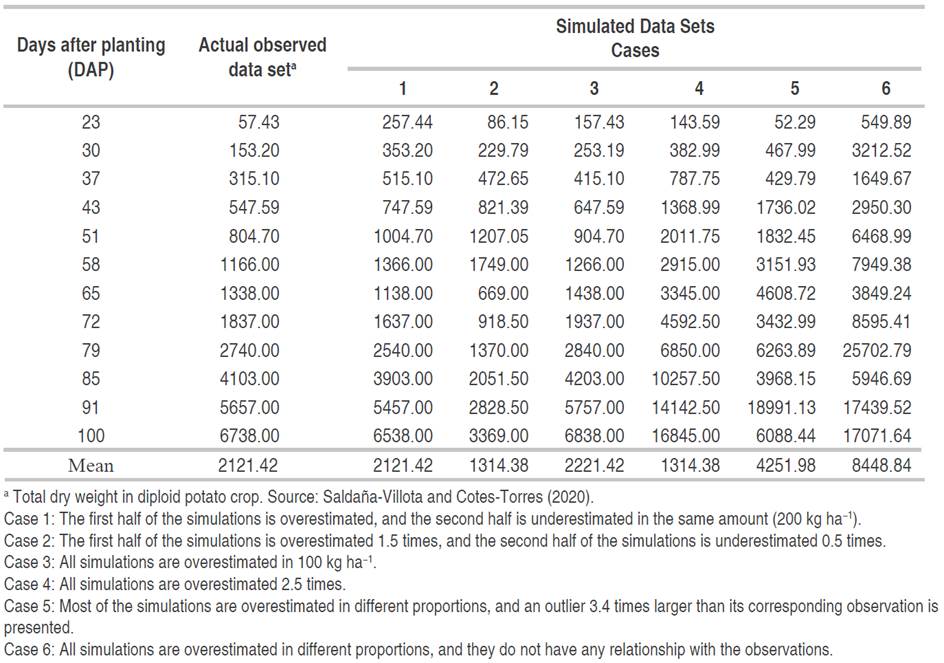 The performance of nine statistical indices was computed to evaluate the simulations of actual observations and simulations of total dry weight (kg ha-1) obtained in a diploid potato field experiment conducted in Medellín, Colombia. This data set were taken from Saldaña-Villota and Cotes-Torres (2020). Besides, from the actual observed data, six data sets were generated with arbitrary deviations appropriately imposed to illustrate the behavior of the statistical indices under evaluation. (Table 1). In case 1, the first half of the simulations is overestimated, and the second half is underestimated in the same amount (200 kg ha-1). In case 2, the first half of the simulations is overestimated 1.5 times, and the second half of the simulations is underestimated 0.5 times. In case 3, all simulations are overestimated in 100 kg ha-1. In case 4, all simulations are overestimated 2.5 times. In case 5, most of the simulations are overestimated in different proportions, and an outlier 3.4 times larger than its corresponding observation is presented. Finally, in case 6, all simulations are overestimated in different proportions, and they do not have any relationship with the observations.