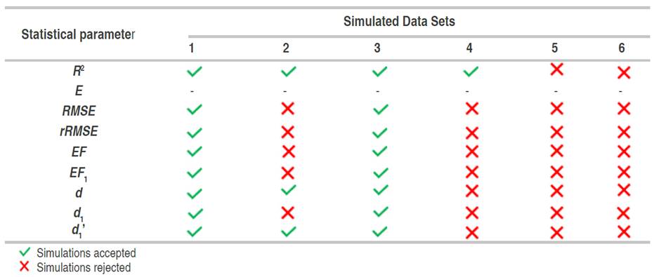 Table 2: Acceptance or rejection of the simulations defined by different statistical indices for each data set.