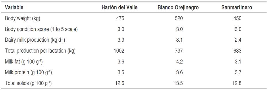 Table 1 presents the weight, body condition score, production, and composition of the milk of the experimental cows. These animals were subjected to health prevention and control programs following the regular schedules and plans provided by the center, which included vaccination against foot-and-mouth disease and brucellosis in females and control of external and internal parasites twice a year for all animals. All experimental procedures were reviewed and approved by the animal ethics committee at the Faculty of Agricultural Sciences of La Salle University.