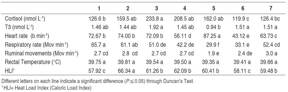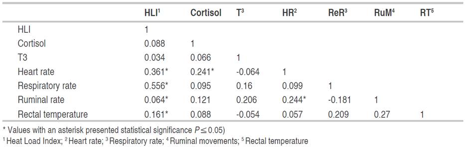 The variables analyzed between hormones, climatic information, and the HLI did not correlate (P≥0.05) between physiological parameters and the caloric load index (HLI).