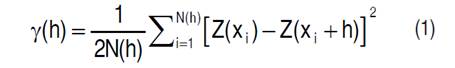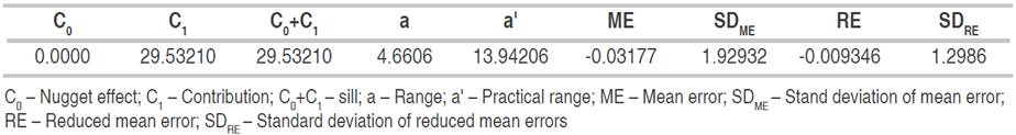 Where N (h) is the number of experimental pairs of observations, Z(xi) and Z(xi+h) and separated by a distance h, the semivariogram is represented by the graph γ(h) estimated semivariance for distance h. From the adjustment of a mathematical model to the calculated values of γ(h), the coefficients of the theoretical model are estimated for the semivariogram called the nugget effect, C0; threshold, C0+C1 and the reach, a, as described by Vieira et al. (1983).