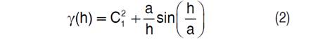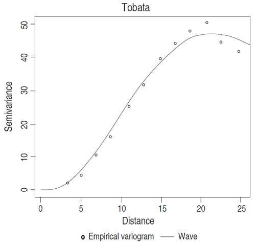 Equation 2 represents periodic variations, which indicate non-monotonic growth of the semivariance with distance, presenting models with and without threshold (Andriotti, 2004). These non-monotonic structures can have reduced wave amplitudes, be isotropic, and be anisotropic (Carvalho et al., 2004). Another analysis that must be carried out is based on the relationship between theoretical and practical scope. According to Chilès and Delfiner (2012), the practical range of the Wave model is reached when the h is approximately equal to 4.5a.