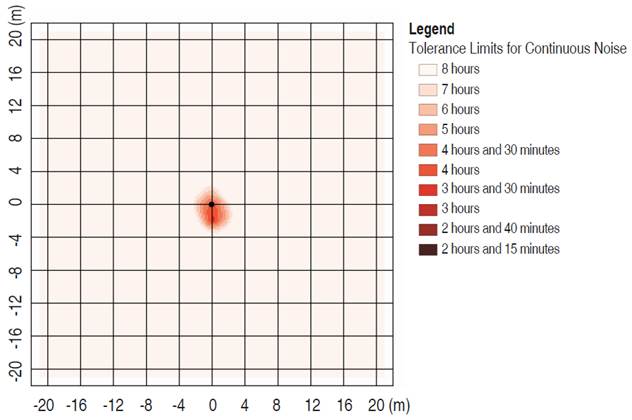 It is observed in Figure 3 that the alarming values of the noise emitted by the micro-tractor, above 85 dB (A), for daily exposure of 8 h (ABNT, 2021) are seen, in general, up to 6 m of distance around the tractor in operation regime. Note that in the center of the map (0,0), where the operator is positioned, the measured noise level was 91.20 dB (A), represented by the red color. This value can be considered high for daily exposure. The regulatory standard (NR 15) Ordinance 3,214/78 Ministry of Labor and Employment (MTbE) establishes that the maximum noise level allowed for 8 h of daily exposure is 85 dB(A). Above this limit, noise and disturbing human activities can cause serious damage to health (Silva et al., 2004).