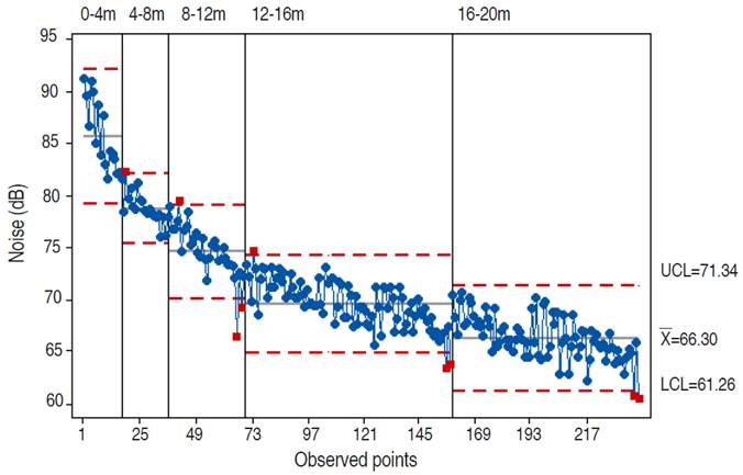 In addition to the geostatistical analysis, the noise data emitted by this micro-tractor was evaluated through process control charts (SPC). Control charts also present complementary criteria for quality analysis. Including a sequence of points occurrence, upward downward trends, shifting in the process cyclic patterns, points plotted close to the control limits and clustering around the mainline (Szekut et al., 2018). Civardi (2017) suggested a sequence of steps to analyze the control charts: build experimental control limits after data collection according to the sampling plan; verify that all points are within the control limits and no random configuration is being performed. If these two conditions are met, it can be said that the process is under statistical control, and the next step is to assess the capacity of the process; if there are points outside the control limits and/or some non-random configuration, it may conclude that the process is out of the state of statistical control. In this case, special reasons that caused each point should be identified.