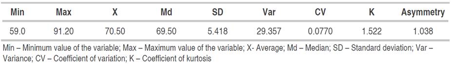 Still, analyzing the control chart present in Figure 6, it is possible to observe the convergence of the distribution values around the average and note that most of these values are close to their respective stages during the process. The points distribution is explained according to the coefficients of asymmetry and kurtosis with positive values, in which the distribution of values tended to be more to the left and more flattened. Therefore, in a positively asymmetric distribution, the tendency is for positive deviations to be much more significant than the negative ones. Concerning the behavior of the tail being more flattened, it is linked to the kurtosis value of the distribution, which is greater than 0.263 (Table 1), the distribution is flatter than the normal curve of the same area, and it is said to be a platicurtic curve. (Sindelar et al., 2014).