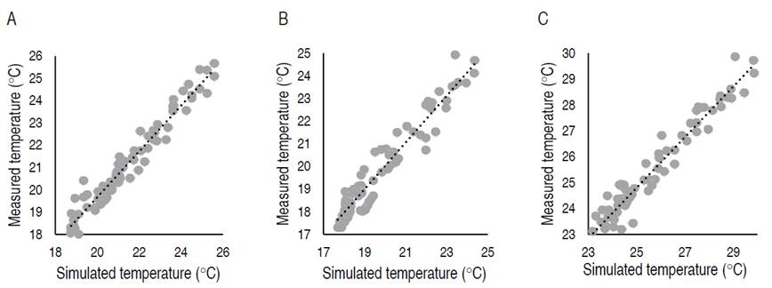 Therefore, it is possible to affirm that the proposed simulation models are capable of predicting the hygrothermal behavior within the three facilities. The models can facilitate decision-making to improve the behavior of environmental variables within this type of construction.