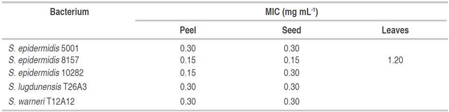 The methanolic extracts obtained from seeds, peels, and leaves of M. dubia showed antimicrobial activity against Staphylococcus spp. as shown in Table 1. The extracts studied did not show inhibition against S. aureus. For S. epidermidis 8157, the inhibition occurred due to the action of β-sitosterol and betulinic acid present in the methanolic extract of leaves (Roumy et al., 2020).