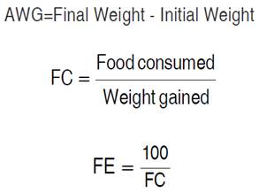 Animal performance parameters. Within the performance parameters evaluated, accumulated weight gain (AWG- Indicates how much weight an animal gains by sampling age), feed conversion (FC), and feed efficiency (FE) were selected, according to Li et al. (2019). The parameters were evaluated on days 21 and 42. AWG, FC, and FE were calculated by parameterization of the following equations: