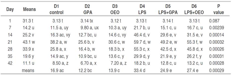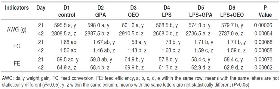 Feed efficiency (FE). FE for day 21 obtained a significant statistical difference (P <0.05) between D3 and the other diets, except for D2, which also presented statistical differences (P<0.05) with D4, D5, and D6. However, these last diets did not show differences with D1 (P>0.05). On day 42, there was no significant statistical difference (P>0.05) between D2 and D3, and neither between D5, and D6. Nonetheless, a statistical difference (P<0.05) was found between D1 and the other diets. Further, a statistically significant difference (P<0.05) was evidenced between day 21 (completion of the growing stage) and day 42 (completion of the fattening stage) for FE within each diet under study. With the data obtained in this work, most results showed a positive effect on the zootechnical parameters when using GPA (D2) and OEO (D3), when compared with the basal diet (D1). These results corroborate what was found in other studies that compared different levels of OEO inclusion with a basal diet and another diet with Zinc Bacitracin as a GPA (Madrid-Garcés et al., 2017). The addition of LPS (D4) harmed the zootechnical parameters when compared with those obtained with the basal diet (D1) and with the diets that had GPA and OEO; however, in the diets that were given together with LPS+ GPA (D5) and LPS+OEO (D6), there was an improvement in the values, without reaching the values found with the basal diets (D1, D2, and D3). The values found on day 21 are similar to those reported by Trómpiz et al. (2011); these authors evaluated different diets on the fattening parameters of female chicks in their raising phase.
