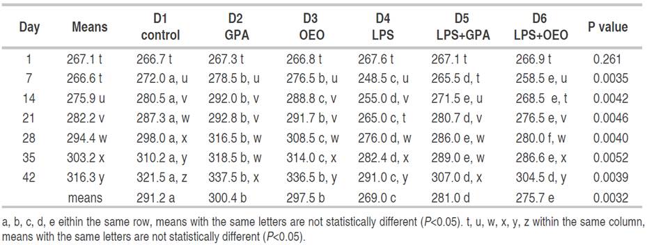 Accumulated weight gain (AWG). The accumulated weight gain (Table 2) did not show a statistically significant difference (P>0.05) at 21 days of age in the diets without the addition of LPS, obtaining D3 the numerically highest value in the different variables evaluated; furthermore, there was no difference (P>0.05) between the diets with the addition of LPS, where a reduction in productive performance was observed. When comparing the diets with LPS and those without the addition of LPS, the LPS-free diets presented better values (P<0.05). On day 42, a significant statistical difference was found between the diets, and D3 showed the best values (P<0.05). However, there were no differences (P>0.05) between D5 and D6. A statistically significant difference (P<0.05) was evidenced between day 21 (completion of the growing phase) and day 42 (completion of the fattening phase) for the AWG variable within each diet under study.