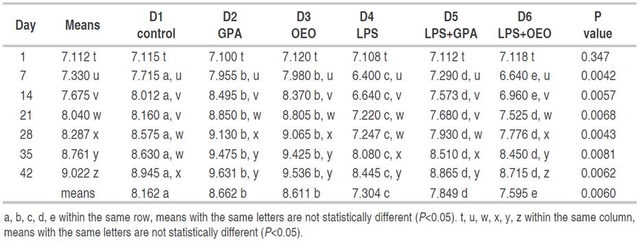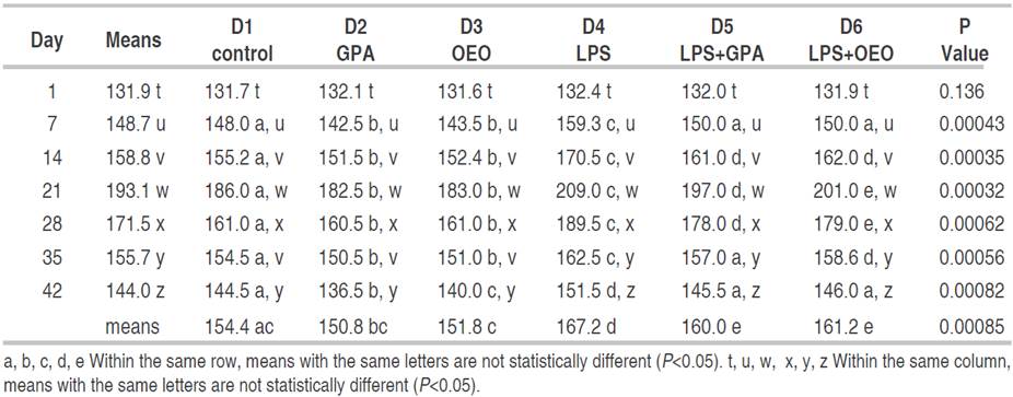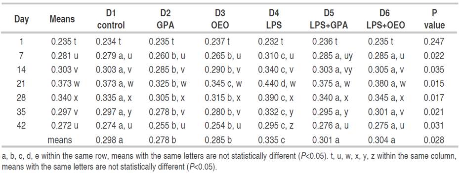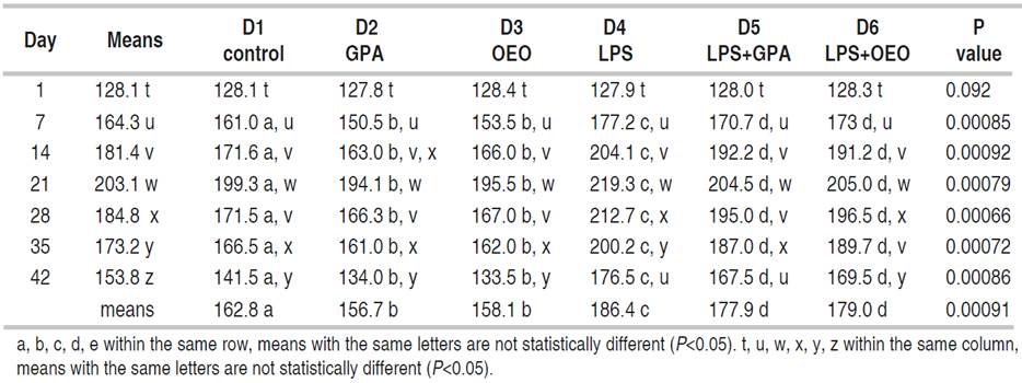Cholesterol. For the variable blood cholesterol, mean values were found for the different ages from 131.8 mg dL-1 (Day 1) to 193.1 mg dL-1 (Day 21), with statistically significant differences between all the ages assessed (P<0.05). Day 21 presented the highest values in each of the diets evaluated. For the different diets, values from 150.8 mg dL-1 (D2) to 167.2 mg dL-1 (D4) were found with statistically significant differences between all diets, except between D5 and D6, which D4 recorded the highest values (Table 5). Lázaro et al. (2017) found cholesterol values between 105 and 121 mg dL-1, that is, lower than those reported in the current study. Regarding glucose, the differences may be associated with the use of various commercial diagnostic kits. Karimzadeh et al. (2017) reported values between 105 and 140 mg dL-1. Bueno et al. (2017) observed values between 102.9 and 154.8 mg dL-1, and Broch et al. (2017) found values between 104.32 and 117.20 mg dL-1. Diets with the addition of LPS (inflammation model) were shown to have a negative effect, increasing blood cholesterol levels; nevertheless, the addition of GPA and OEO showed a positive effect on the inflammation model, without finding a statistically significant difference between the two treatments (D5 and D6).