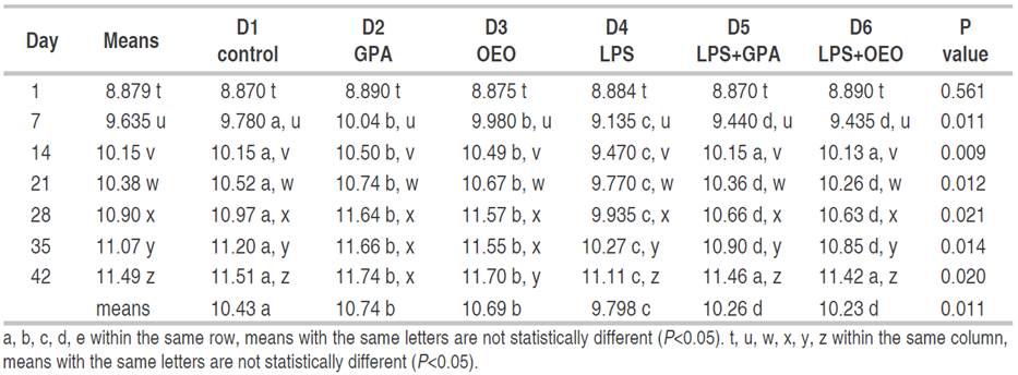 Alanine aminotransferase (ALT). ALT obtained average values per day of age from 3.13 to 43.1 (U L-1), presenting the highest values on day 21 of age (P<0.05). In the average values per diet, significant statistical differences were found for D2 with the other diets (P<0.05), except for D3 and D1(Table 3). Differences were found between D4 with D5 and D6, but no differences were found between the last two (P>0.05). Moreover, no statistically significant difference (P>0.05) was observed between D1 with D2 and D3. ALT results provide specific information about liver problems in an organism. In animals with fatty liver, ALT levels are usually higher (Alegría et al., 2015). Other studies in broilers have reported values between 17.1 and 21.6 mg dL-1 (Bueno et al., 2017), and between 10.84 and 17.28 mg dL-1 (Broch et al., 2017). The addition of GPA (D2) and OEO (D3) was shown to positively affect the ALT concentration in serum, reporting better values from the liver health standpoint. LPS had a negative effect on the ALT concentration, where the addition of GPA (D5) and OEO (D6) was done, having a mitigating effect on the damage generated by the addition of LPS. The negative effect of LPS may be explained by the metabolic demand of the body to generate an inflammatory response in the presence of a molecular pattern associated with a pathogen in the intestine.