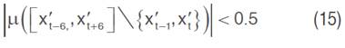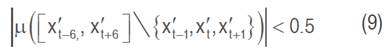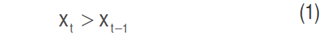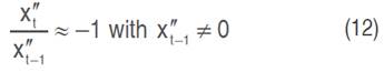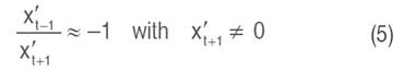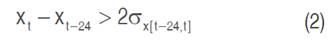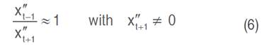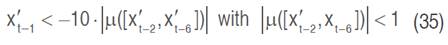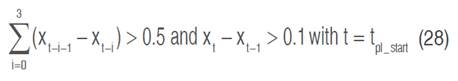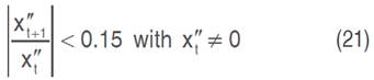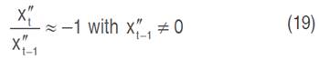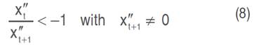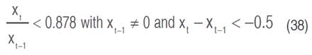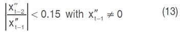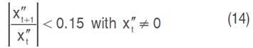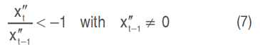 3. A negative jump is seen with a negative second derivative, with a positive value for t+1, which must be maintained after the marked change (equation 13), equation 14 was added where the division was reversed since