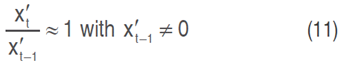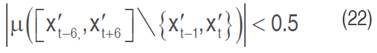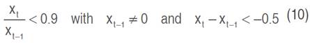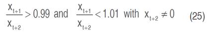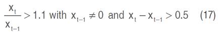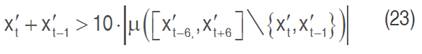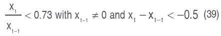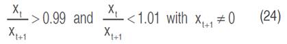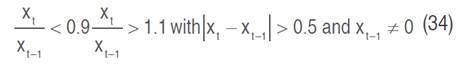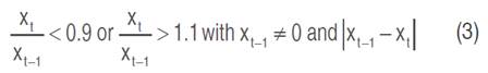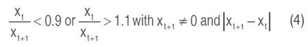 1. Single measurement that differs significantly from observations xt-1 and xt+1 of xt, xt must vary less than 10% (equations 3 and 4).
