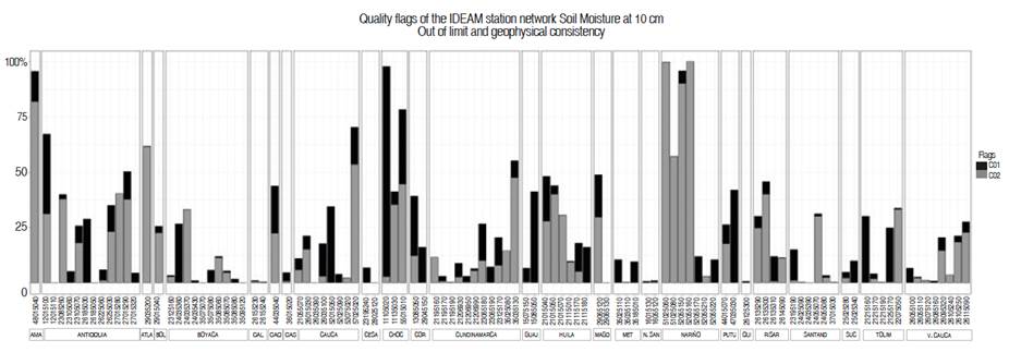 Figure 3: Percentage of out-of-limit quality flags and geophysical consistency at a depth of 10 cm in the data series from the IDEAM agrometeorological network.