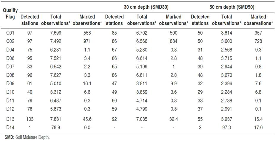Table 3: Quality flags detected (* in thousands) by depth. Data series from the IDEAM agrometeorological network.