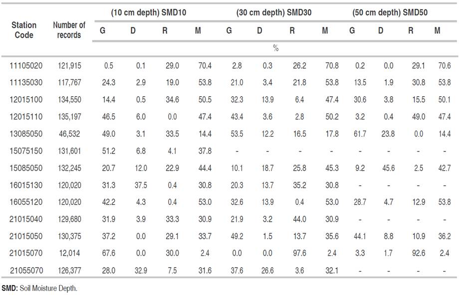 The results show that 40.3% of the soil moisture records were good (G), 12.9% were doubtful for the spectrum (D), 14.3% were doubtful for the geophysical range (R) and the remaining 32% of the data were erroneous (M), either because they were outside the geophysical range and/or data were missing (Figure 2).