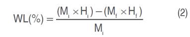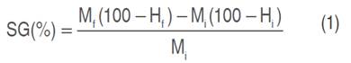 Where: Mi=fresh-cut fruit weight (g); Mf=vacuum impregnated fresh-cut fruit weight (g); Hi=fresh-cut fruit moisture content (%); Hf=vacuum impregnated fresh-cut fruit moisture content (%). Determinations were done in triplicate.