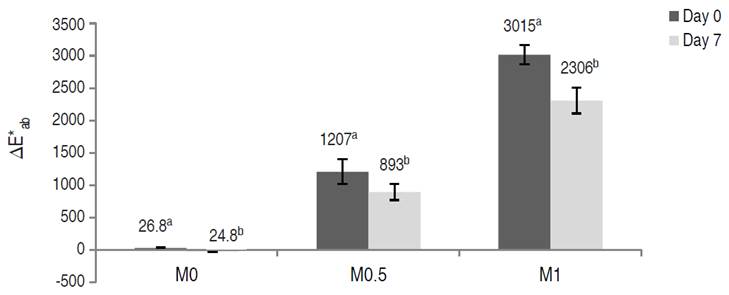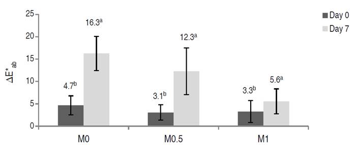 Figure 1: Color difference (∆E*ab) in vacuum-impregnated fresh-cut apples on days 0 and 7 of storage at 1.5 °C.