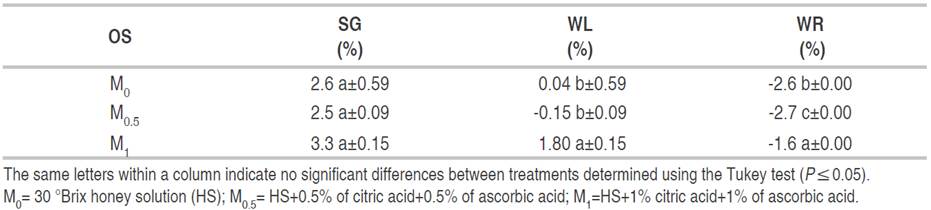 Table 1 shows that OS affected WL (P≤0.05). No differences between M0 and M0.5 treatments were detected; however, M1 treatment produced greater WL. WR was also affected by OS (P≤0.05). All treatments resulted in a weight gain (indicated by the negative sign of WR). The present results agree with those of Mujica-Paz et al. (2003), who reported similar results for fresh-cut Golden Delicious apples due to the high porosity of apples, which facilitates the impregnation of hypertonic solutions (40 °Brix).