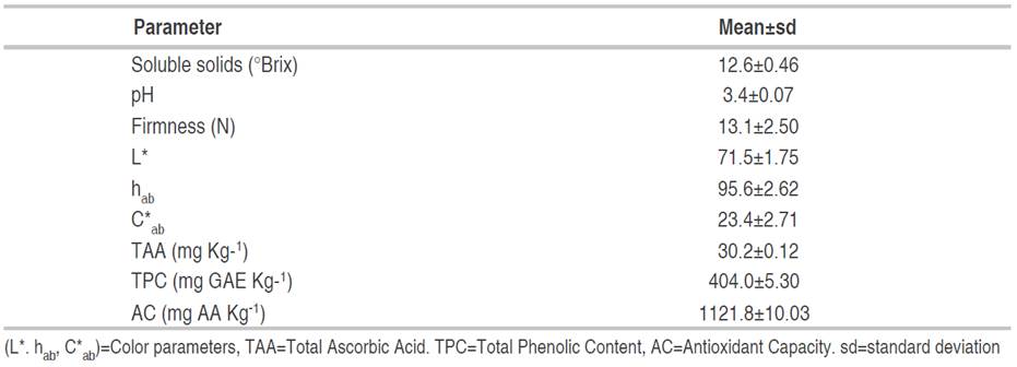 The soluble solids (SS), pH, firmness, color parameters (L*. hab, C*ab), Total Ascorbic Acid (TAA), Total Phenolic Content (TPC) and Antioxidant Capacity (AC) for fresh-cut fruit are presented in Table 2.