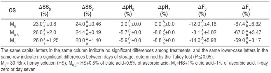 Table 3 shows the relative variation percentage for SS as a function of OS on days 0 (∆SS0) and 7 of storage at 1.5 °C (∆SS7). No significant effect of OS (P≥0.05) was observed on either day. SS increased in VI fresh-cut fruit with respect to fresh-cut fruit by approximately 25% and 24%, on days 0 and 7 of storage at 1.5 °C, respectively.
