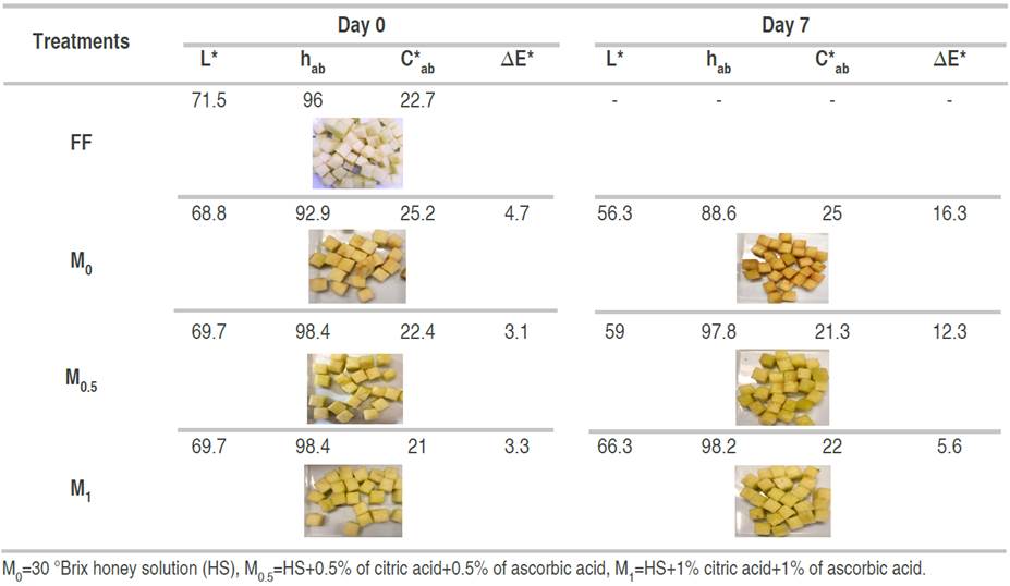Our results agree with the behavior reported by Jeon and Zhao (2005), who observed that the use of dark honey generates a reduction of L*. This is a potential problem in light-colored fruits such as apples because the fruit acquires a color similar to that of honey. Browning inhibition in crushed Red Delicious apples with the addition of 1% honey and 0.1% AA is three times higher than in samples obtained only with honey addition (Chen et al. 2000).