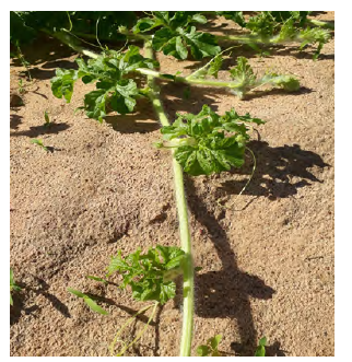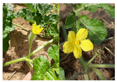 As folhas são ricas em proteína (23%), minerais e flavonoides. Na África Austral, folhas tenras da melancia forrageira são cozidas (morogo, talane, motshatsha ou mokhusa na língua indígena sul-africana sepedi) e consumidas com mingau de milho, sorgo ou milheto (Ngwepe et al. 2021). As flores são solitárias, raramente agrupadas, axilares, opostas às gavinhas, de 2 a 3 cm de diâmetro, com cinco pétalas amarelas claras, que se abrem nas primeiras horas da manhã, e cinco sépalas esverdeadas (Figura 4).
