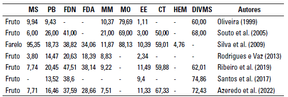 Rodrigues e Vaz (2013), em estudo que avalia a composição nutricional da melancia forrageira para a alimentação de novilhos, verificaram que a melancia apresentou elevados teores em proteína bruta (14,47% ± 4,54) e em CNF (53,80% ± 8,89). No entanto, devido aos baixos teores em MS (3,8% ± 1,62), FDN (20,63% ± 2,80) e FDA (18,39% ± 2,93), sugeriram que a melancia só seja utilizada na alimentação de ruminantes se associada à ingestão de alimentos forrageiros secos, com o objetivo de aumentar os teores em MS, FDN e FDA para valores > 40%, > 40% e > 21%, respectivamente.