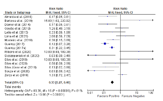Os resultados obtidos do bando de dados foram submetidos à análise descritiva e à distribuição normal dos dados por meio de um histograma de frequência com o auxílio do software Sisvar, versão 5.6, com nível de 5% de probabilidade. A elaboração do gráfico forest plot foi realizada com o software Review Manager 5.4.1.