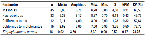 A qualidade microbiológica dos alimentos está diretamente relacionada com a saúde pública e a qualidade higiênica dos estabelecimentos de processamento e comercialização. Nesse sentido, podemos observar que o elevado coeficiente de variação (CV%) demostra essa alteração do padrão microbiológico (Tabela 2), com CV superior a 46% para todos os microrganismos avaliados.